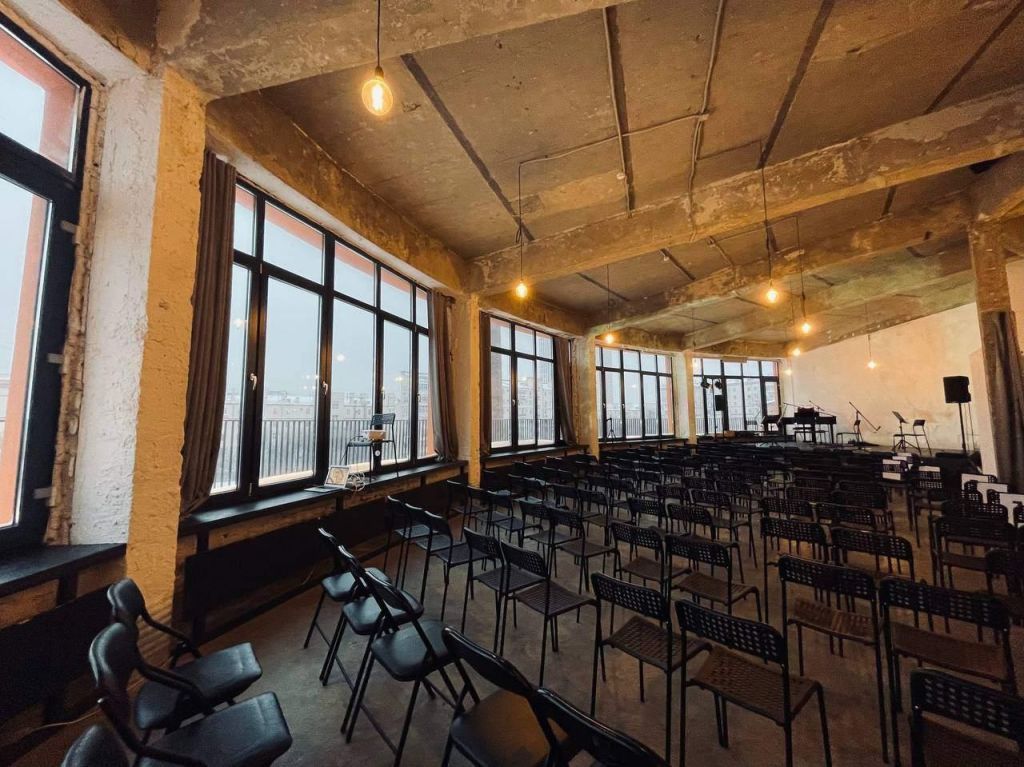 5-й этаж Цилиндра – событийная площадка на последнем этаже главного исторического здания «Хлебозавода». Полукруглое пространство с панорамными окнами и выходом на круговую террасу. В помещении сохранилась память о конструктивистском прошлом здания, осталась фактурность стен и воздушность площадки.