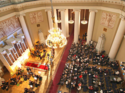 В зале Таврического дворца симфоническая музыка звучит особенно масштабно и ясно благодаря продуманной акустике и архитектурной логике пространства. Купол и колоннада подчёркивают широту звучания и драматургию произведений.