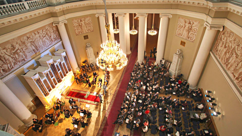 Историческое пространство Таврического дворца создаёт естественную среду для звучания органа. Просторный купольный зал с колоннадой и лепным декором подчёркивает объём и глубину инструмента, позволяя звуку свободно разворачиваться под сводами.