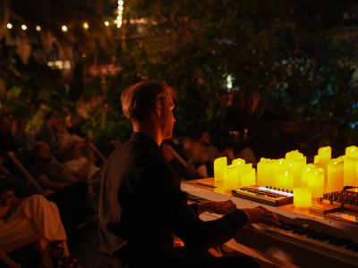 Под куполом Оранжереи Таврического сада виртуозный пианист Лев Шишкин исполнит самые известные саундтреки из шедевров кино в окружении сотен свечей и вечнозелёных растений.