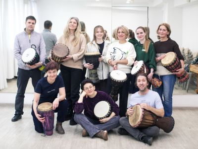— Барабанная школа Megapolis Drums. Группа продолжающих. В этом сезоне занимаемся ритмами Западной Африки — основной инструмент африканские джембе. На концерте сыграем две композиции, основанные на ритмах Djabara и Fanga.