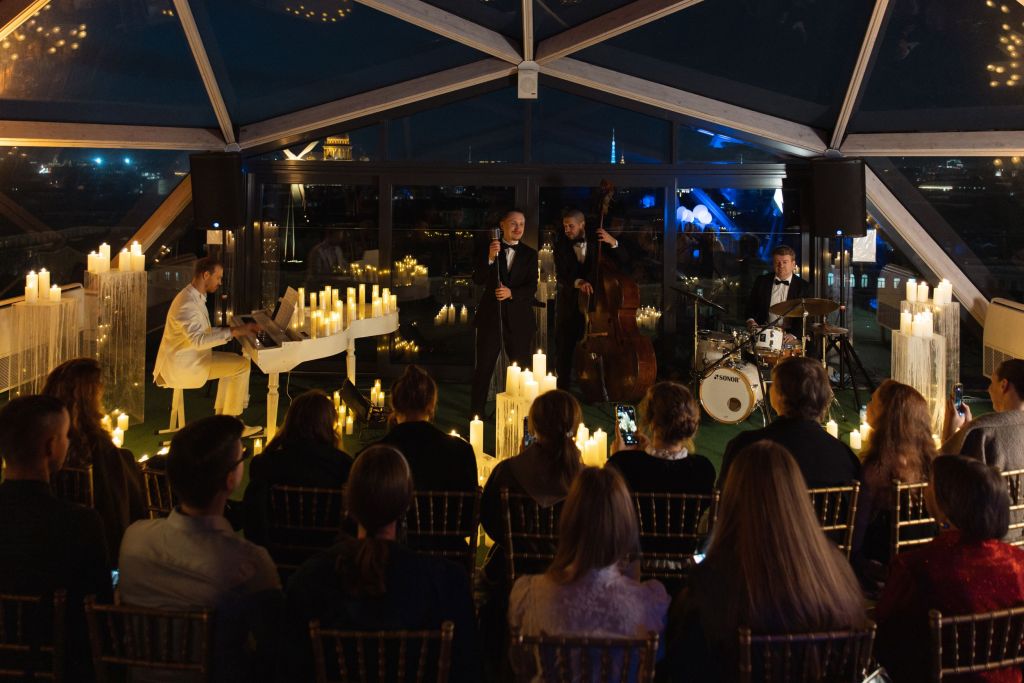 В окружении сотен мерцающих свечей и бескрайнего неба для вас выступит неподражаемый джаз-бэнд Jazz Hooligans. Легендарные хиты, от которых замирает сердце — L. O. V. E., Fly Me To The Moon, Cheek To Cheek — наполнят воздух магией. Здесь, между небом и землёй, Петербург покажется вам городом, созданным для любви.