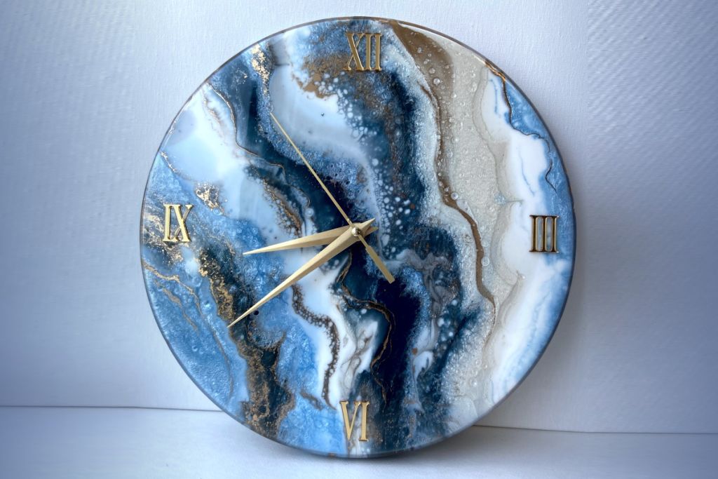 С нами вы погрузитесь в мир искусства, научитесь работать с эпоксидной смолой и самостоятельно создадите настенные часы, имитирующие рисунок благородного камня мрамор. Причудливые переливы краски формируются почти сами собой. Все, что нужно художнику — развести смолу и, наливая на основу, создавать свой собственный шедевр.