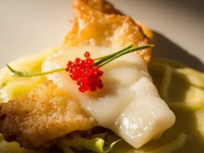 Филе судака с луком-пореем и соусом из белого вина;