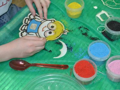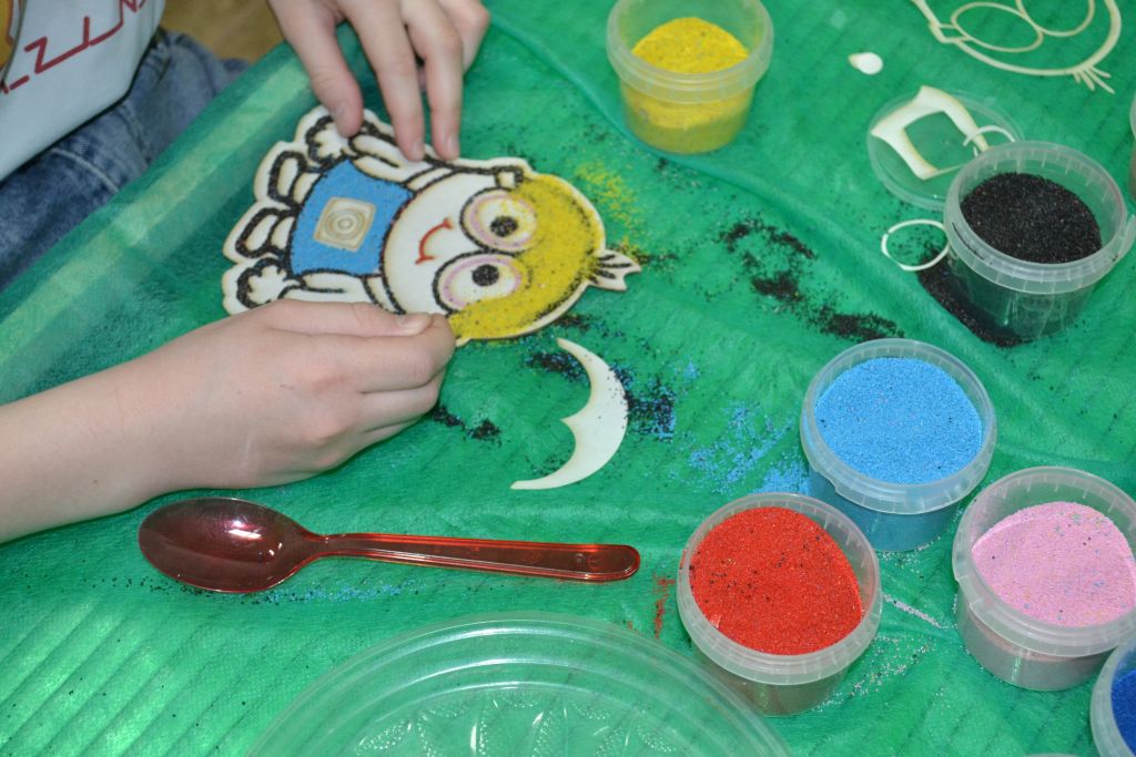 — Мастер-класс по созданию картины из цветного песка по трафарету формата А5, которую дети забирают с собой.