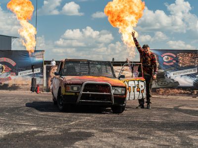 — Трюк «Горящая стена» — пробивание автомобилем на полном ходу огненной стены!