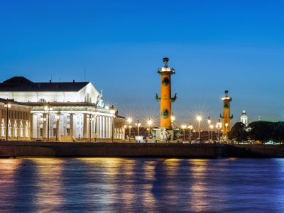 • Наслаждаемся необычным видом на Ростральные колонны, осматриваем стрелку Васильевского острова и здание Биржи.