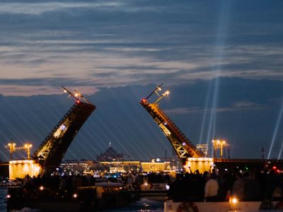 Мимо огней дворцов, особняков и замков. Выйдет в Неву и пройдёт к Большой Невке, чтобы открыть пассажирам виды на известнейший крейсер Аврора, далее пройдёт в центральную акваторию Невы, сделает разворот у Медного Всадника и в самую центральную часть Невы, чтоб занять лучшие видовые места у Дворцового моста и замереть в ожидании невероятного зрелища — разведения мостов. После просмотра разведения Дворцового и Троицкого мостов, теплоход вернётся в Фонтанку на свой причал.