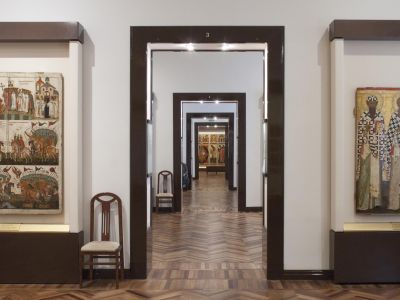 В двух залах экспонируются выдающиеся по своим художественным достоинствам и почти полной сохранности ансамбли новгородских иконостасов середины XVI в. — церкви Апостолов Петра и Павла в Кожевниках и собора Рождества Богородицы Антониева монастыря.