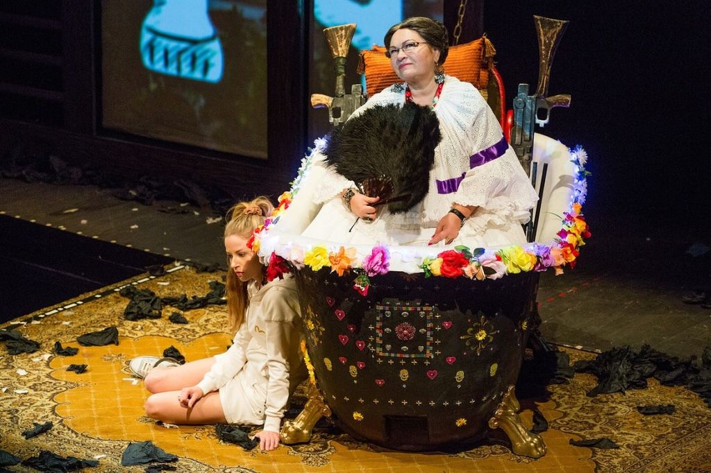 Музыкальный спектакль по новелле оформлен в духе мексиканских ретаблос — наивных рисованных открыток, в которых люди благодарят святых за помощь.