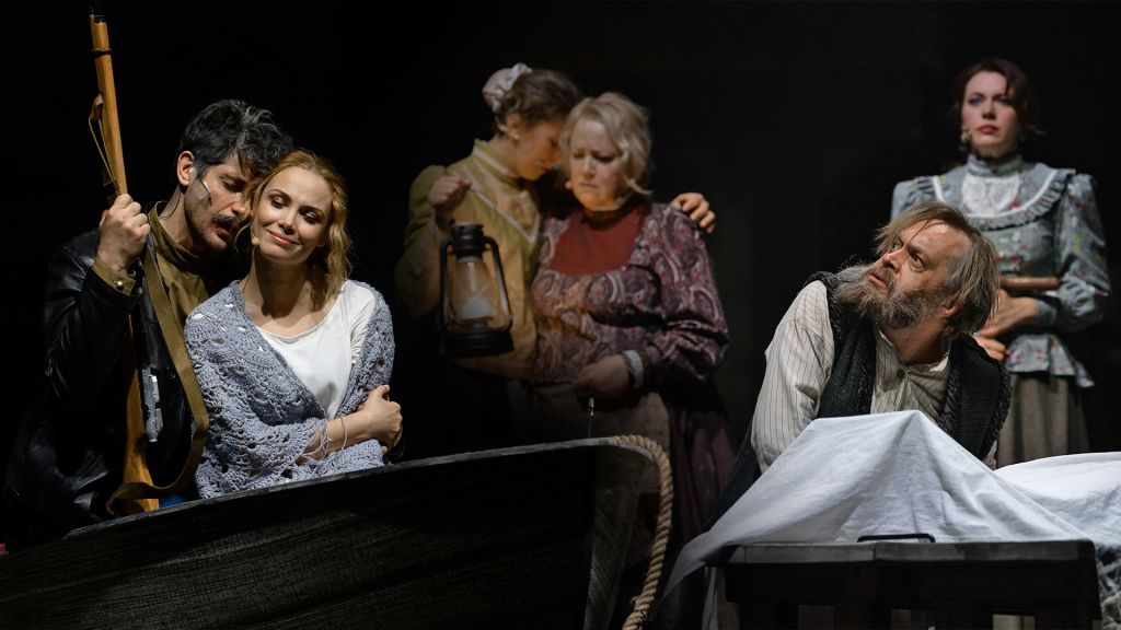 Гладь Дона, затянутая легкой утренней дымкой, деревянные речные мостки, песня удалая казачья, доносящаяся издалека... Внезапно разыгравшаяся буря разрушит и эту хуторскую идиллию с привычным укладом жизни казаков, и судьбы главных героев, и перевернет жизнь целой страны. Режиссер спектакля «Тихий Дон», Дмитрий Петрунь мастерски сумел вместить в трёхчасовой спектакль самые яркие моменты жизни героев легендарного романа Михаила Шолохова. В центре сюжета остается Гришка Мелехов, угодивший в жернова исторических потрясений, успевший испытать за очень небольшой промежуток времени любовь и предательство, страсть и измену, сумевший преодолеть все удары судьбы — не сломаться и выстоять. Получился своеобразный киномонтаж на театральной сцене. Не просто спектакль, а грандиозное сценическое полотно, в котором переплелись эпический размах и трагедия людских судеб. В составе исполнителей возможны изменения.