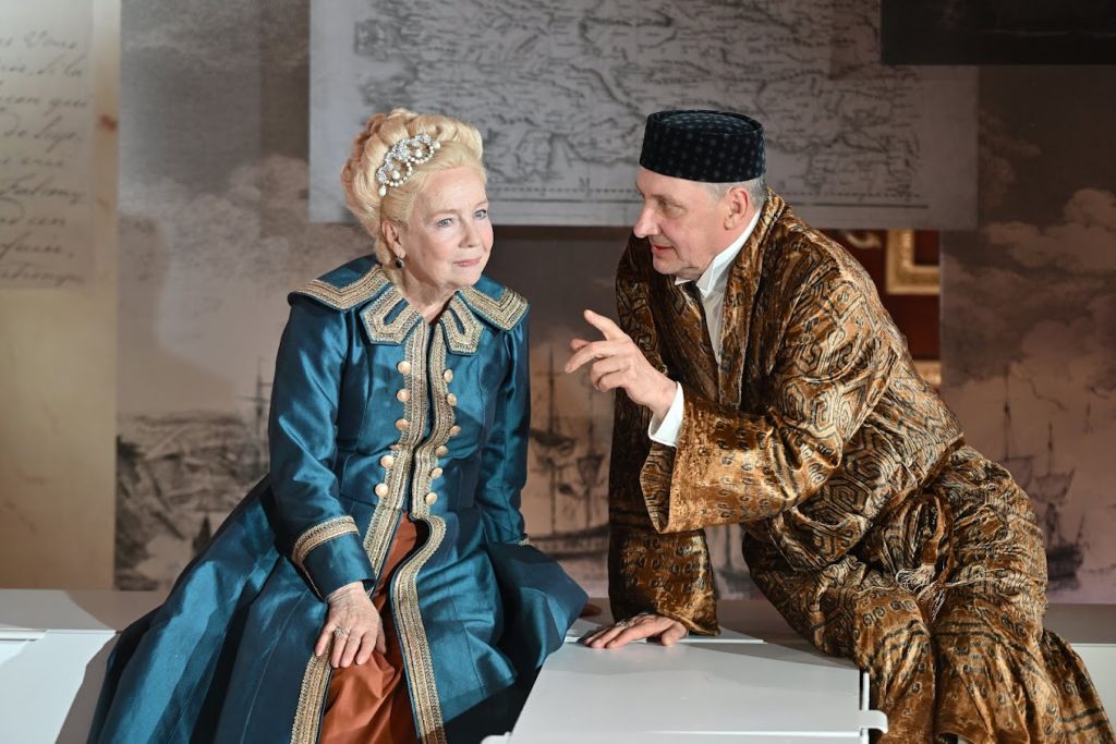 Спектакль Никиты Кобелева продолжает линию работ, посвящённых осмыслению российской истории на национальной сцене. В литературной основе — подлинные тексты переписки российской императрицы Екатерины Второй (1729–1796) и французского мыслителя, первого философа и писателя эпохи Просвещения Вольтера (1694–1778). Переписка между ними шла 15 лет, с 1763 по 1778 год. Русскому читателю достаточно полный корпус текстов (185 писем) впервые стал доступен только в 2022 году, с выходом издания «Екатерина II и Вольтер. Переписка». Сегодня эпистолярные беседы российской самодержицы и французского вольнодумца — памятник эпохи, но и свидетельство характеров, роман отношений двух великих людей, уважавших и любивших друг друга. Екатерина обдумывает с Вольтером самый широкий круг тем: от политики и устройства государства до естественных наук и современной им литературы. В центре переписки — конфликт Российской и Османской империй, вопросы русско-турецкой войны 1768–1774 годов. Рассматривается создание новой российской правовой системы — свод законоуложений. Они говорят о многом; о необходимости оспопрививания, о швейцарских часах и даже обсуждают Россию как родину слонов, которых в то время не очень отличали от мамонтов. Все тексты писем, звучащие в спектакле (за исключением пролога и эпилога) — это подлинная, историческая переписка. Острота мысли, образность фразы, изящество лести, дуэль и дружба двух великих современников — всё это сохранено в письмах и вошло в поэтику спектакля. «Екатерина и Вольтер» — отчасти ещё и оммаж французскому театру XVIII века, с его изящной иронией и фарсовой природой. И вместе с тем, это история становления личности российской императрицы, почитавшей себя ученицей Вольтера. В спектакле звучат фрагменты произведений Георга Фридриха Генделя: из увертюры к оратории «Самсон», оперы «Роделинда», сюиты  3 ре минор: Allegro. При создании пьесы использовались издания: «Переписка российской императрицы Екатерины II и господина Вольтера, продолжавшаяся с 1763 по 1778 год» (Вольная типография Гария и компании, 1803); «Екатерина II и Вольтер. Переписка» («Университет Дмитрия Пожарского», 2022). При создании декорационного оформления спектакля использовались: Репринт рисунка печати Вольтера, представленный 10 марта 1869 года в журнале L’Intermédiaire des chercheurs et curieux; Репринт карты «План Движений Атаки и совершенной победы над неприятелем победоносных Войск Ея Императорскаго Величества в Молдавии при реке Ларге 1770 Года Июля 7»; Репринты фрагментов писем императрицы Екатерины II.