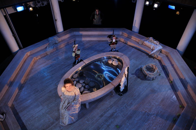 Начинается действие на земле, в средневековом городе у фонтана с Каменным ангелом, к которому юные девицы приходят рассказать о своей несчастной любви, и лишь одна, Аврора — о счастливой, о любви к нему. Вслед за Авророй зрителю предстоит спуститься в нижний, демонический мир, где в роскошных чертогах царствуют Венера с Амуром, насылая на смертных душевные страдания (сцена «Глобуса» устроена так, что этот спуск стоит понимать буквально). С небес же, из-под купола зала, появляется Ангел, уже во плоти и крови, чтобы разогнать темный морок преисподней и проводить обманутую душу Авроры к Богоматери.
