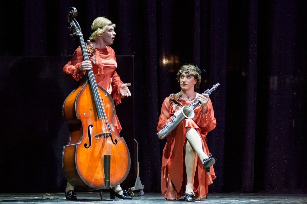Чтобы избежать гибели от рук гангстеров (банды чикагских мафиози во главе с Коломбо) бедные джазовые музыканты, Джо и Джерри, ставшие случайными свидетелями их промысла, устраиваются в гастролирующий женский джазовый оркестр. Парни вынуждены переодеться в женскую одежду и сменить имена — теперь они Джозефина и Дафна. На гастролях в курортном городке с оркестром выступает солистка по прозвищу Душечка. Джо влюбляется в девушку и, появляясь перед ней то в образе молодого миллионера Джуниора, то в качестве «подружки» Джозефины, пытается склонить её к взаимности. В это же время в Дафну влюбляется отдыхающий на курорте пожилой миллионер Озгуд Филдинг. Решая свои любовные проблемы, герои не замечают, как оказываются совсем рядом со своим врагом Коломбо. Лишь чудом Джо и Джерри удается ускользнуть от бандитов и спастись от смерти. В финале маскарад раскрывается, Душечка признается, что любит Джо, хоть он далеко и не миллионер, а Джерри рассказывает «своему миллионеру», что не может стать его женой, ведь он не Дафна вовсе, а мужчина! Спектакль венчается фразой неунывающего Филдинга: «У каждого свои недостатки!».