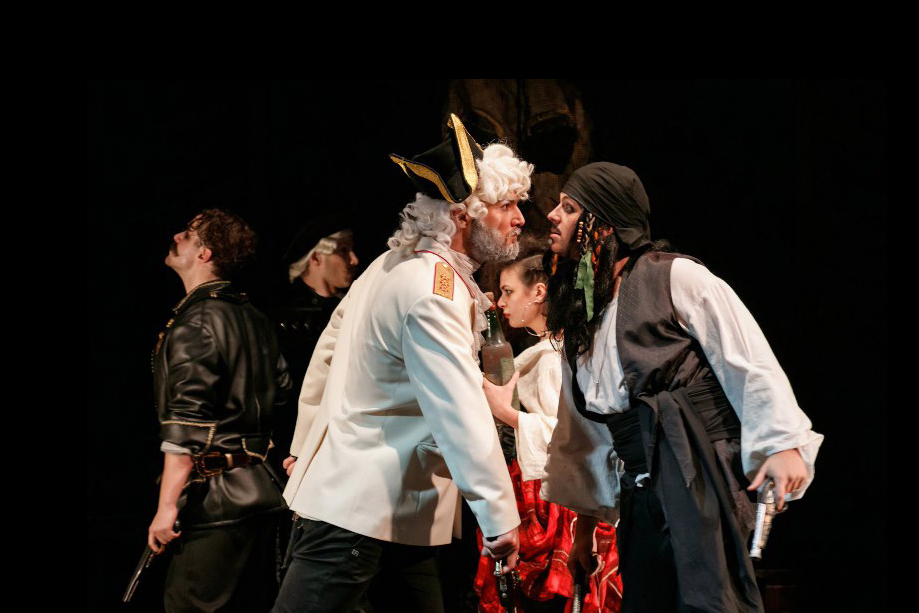 Музыкальная феерия «Остров сокровищ» появилась как дипломный спектакль выпускников Театрального института им. Б. Щукина. Художественный руководитель Театра «У Никитских ворот» Марк Розовский увидел студенческую постановку и был очарован её истинно вахтанговским духом и яркими актерскими работами. Пиратская комедия приключений, как называют спектакль создатели, наполнена громкой музыкой, искрящимся юмором и эффектными трюками. «Остров сокровищ» – это яркое действо, где связанные единым сюжетом сцены динамично сменяют друг друга, артисты в образе благородных героев или ужасных пиратов, отправляясь в опасное морское путешествие за сокровищами, борются с водной стихией, стреляют, сражаются на шпагах, а ещё – смеются, поют и танцуют… Всем, кто знает толк в ветрах странствий и приключениях, от юных до весьма взрослых, постановка придется по душе. Зрители из городской суеты перенесутся прямиком на остров «Сундук мертвеца», со всех сторон омываемый океаном. Текст романа, написанного в 1883 году, звучит очень современно. Этому способствуют слегка «усовершенствованный» юмор и то, что герои спектакля частенько напоминают персонажей самых известных и любимых фильмов и мультфильмов о пиратах. Итак, подросток Джим Хокинс очень любит истории о морских приключениях и мечтает стать капитаном…