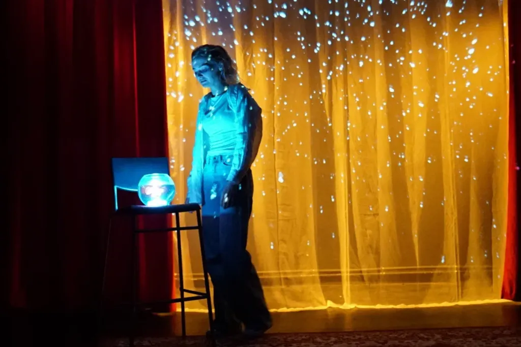 Ковёр и занавес, микрофон, барный стул. Комната и сцена бара одновременно. Хрупкая девушка выйдет на сцену с маленьким круглым аквариумом, заговорит с рыбкой и расскажет ей и нам о себе и о каждом.