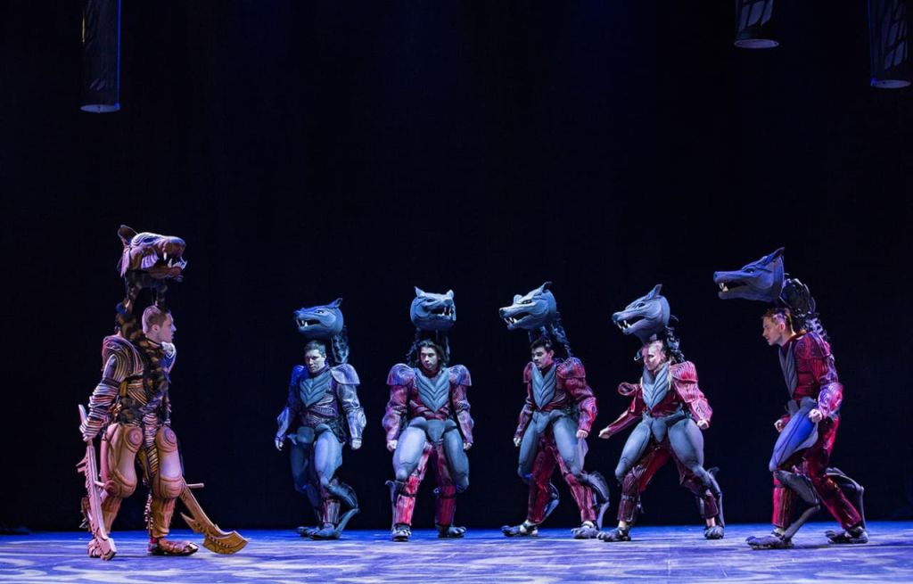 Артисты управляют огромными куклами, сделанными одновременно как ритуальные маски животных и как роботы-трансформеры, работают в сложносочиненном пространстве, поют, отчаянно дерутся.