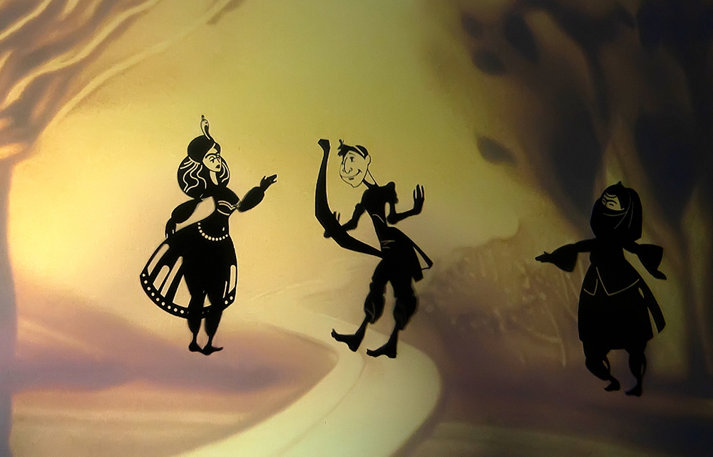 Көлеңкелі театр мен құм шоуының үйлесімі. Қуыршақтардың көлеңкесі үлкен экранда жанданып, ал олардың фоны құм анимациясы арқылы жасалады. Елестетіп көріңіздерші: сарайлар мен пальмалар көз алдарыңызда әп сәтте өсіп шығады, ал сауда алаңының орнына бірден зындан пайда болады. Актердің барлық жұмысы жартылай мөлдір перде артында атқарылды, сондықтан көрермендер қуыршақтардың шебер қолында жандануын тамашалай алады. Ертегі мен шынайы өмір арасындағы шекара бір актердің перде артында болуымен қамтамасыз етіледі. Енді қуыршақтар ғана емес, көрермендер де қойылым оқиғаларына ықпал ете алады. Балалардың көмегінсіз басты кейіпкерлерге өз бақытына жету қиынға соғар. Интерактивті әрекеттер мен залмен өзара әрекеттесудің болуы актерлік импровизация мен әзілге жол ашады. Ал бұл жанрлар қойылымдарда әр ойын сайын жаңашыл әрі өз ерекшелігін жоғалтпайды.