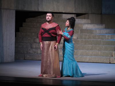 В первой постановке «Аиды» эпоха фараонов воссоздавалась в массивных красивейших декорациях и уникальных костюмах, созданных по зарисовкам Мариетта для премьеры оперы в Париже знаменитым художником Эженом Лакостом. Первые ювелирные украшения для костюма дочери фараона Амнерис были сделаны из золота и драгоценных камней по лучшим древнеегипетским образцам. Не менее тщательно подходили художники и костюмеры и к созданию внешнего облика других героев спектакля.