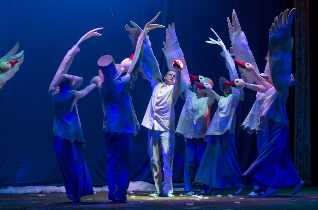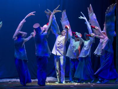 Это история о том, что душа, прошедшая через испытания и страдания, не озлобившись и веря в свою мечту, обретает крылья. В спектакле птичий двор – общество, которое не терпит яркой индивидуальности и избавляется от непохожих. Пройдя тяжелый путь, гадкий утенок заслуживает награду: он не только принимает облик прекрасного лебедя, но и находит свою любовь. Художественное решение постановки предполагает использование всего сценического пространства, «живой план» актеров в костюмах со специальными куклами и масками.