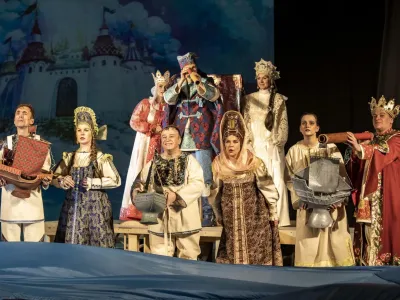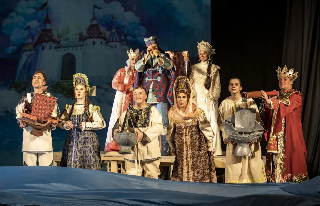 В основе сюжета — одно из самых известных произведений Александра Сергеевича Пушкина «Сказка о царе Салтане, о сыне его славном и могучем богатыре князе Гвидоне Салтановиче и о прекрасной царевне Лебеди». В постановке, выполненной в духе площадного представления скоморохов, сочетаются как динамичное действие, живой юмор, так и проникновенный лиризм, которые переносят зрителя в удивительный сказочный мир. А эпичность пушкинского слога в старинном духе причудливо обрамляют роскошные костюмы и стилизованное музыкальное оформление.