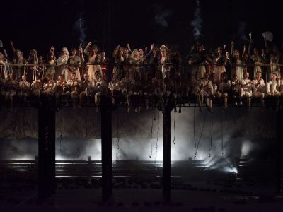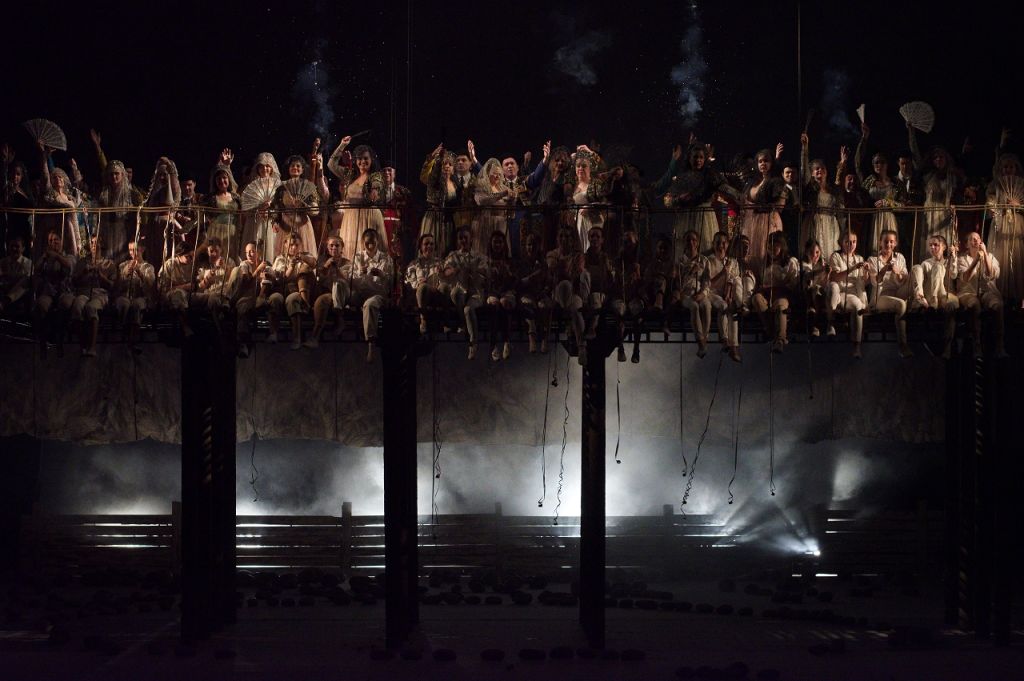 В этом нарочито лишённом красивости, почти целиком песочно-белом спектакле с редкими вкраплениями серого и черного — своя поэзия, кое-где ненавязчиво перекликающаяся с итальянским неореализмом. Но только иногда. По подробностям быта, по чертам характеров все происходит, наверное, где-то на границе Испании и Франции, в середине ХХ столетия. Микаэла прикатывает из своей деревни к Хосе на велосипеде, дерущихся девиц с табачной фабрики разнимают струей воды из шланга, торреро (в обычном современном костюме) заботливо защищают от дождя зонтами очень знакомые зрителю крепкие парни.