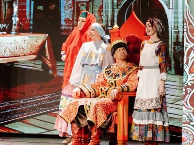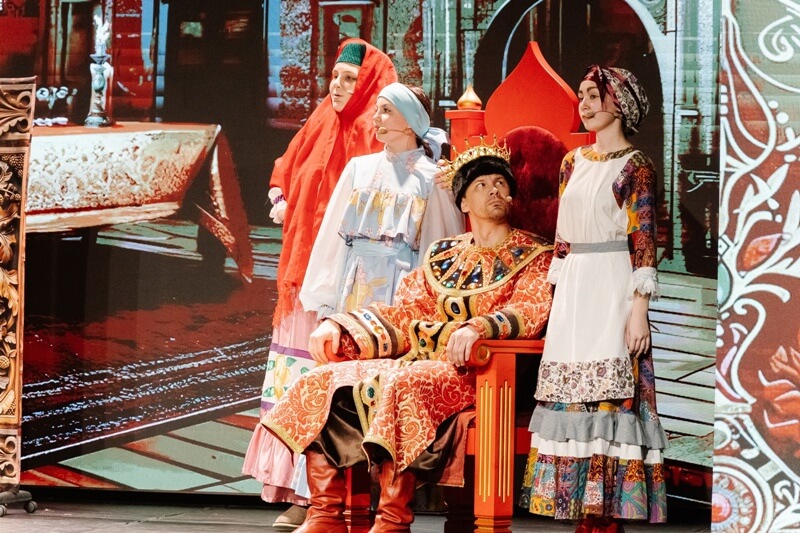 В спектакле по мотивам произведения «Сказка о царе Салтане, о сыне его славном и могучем богатыре князе Гвидоне Салтановиче и о прекрасной царевне лебеди» гармонично сочетаются стихи великого русского поэта А. С. Пушкина и народная музыка, лирика и юмор.