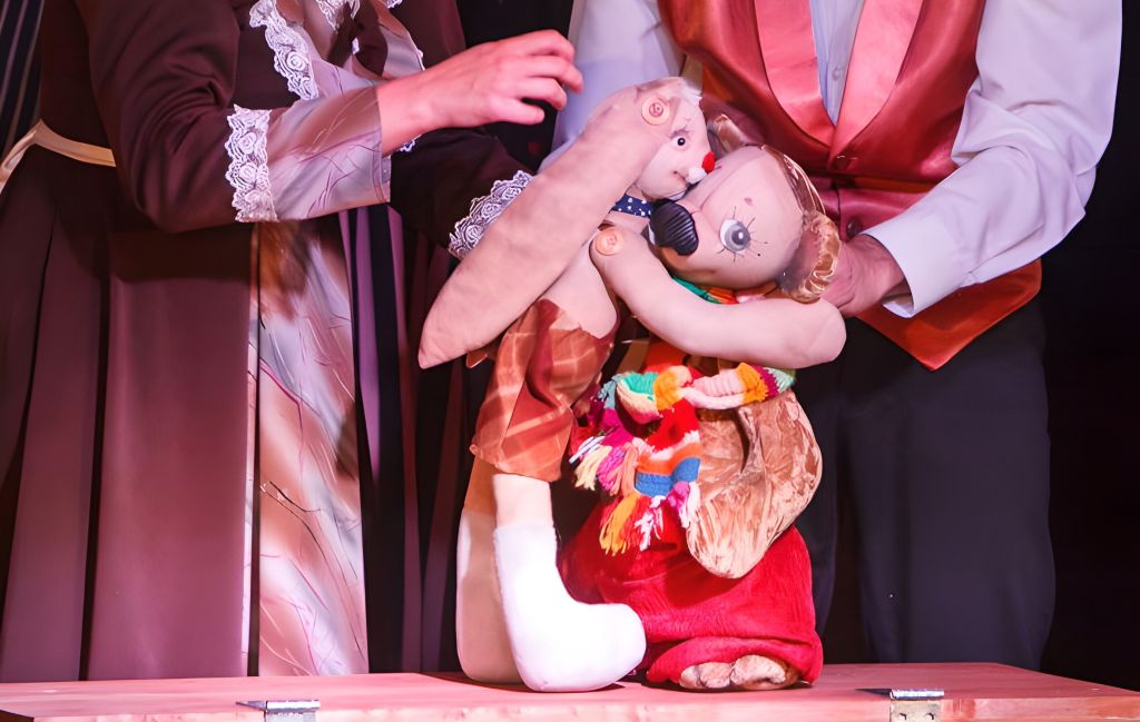 На волшебной сцене Максим Холла — среди старинных чемоданов и вычурных костюмов, среди шляпных коробок и стопок книг — артисты расскажут историю про дружбу Медвежонка и Зайца, про Клоуна и Бегемотика и про Пуговичную ведьму, которая хотела отнять у Зайчика его чудесное сердечко.