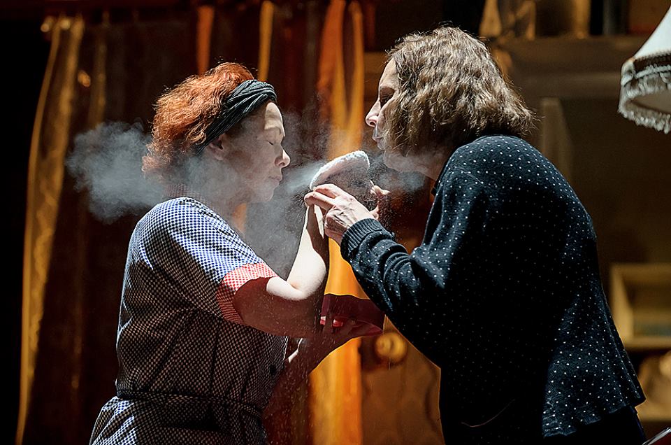 Шифоньер, швейная машинка Зингер, обеденный стол, кровати с железной спинкой, салфетки ришелье — в спектакле живет и дышит послевоенный советский быт, который сохранялся десятилетиями, хоть менялись радиолы и добавлялись холодильники. Буфет, центр этой бердичевской космогонии, незыблем все 30 лет: потому что буфет — это буфет. На сцене воссоздана и бердичевская водонапорная башня — но уже в театральном макете. Башня сгорала, была разрушена, перекрашена — у нее как и у семьи Капцан-Луцких биография на фоне эпохи.