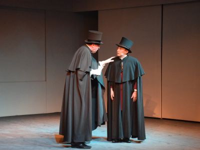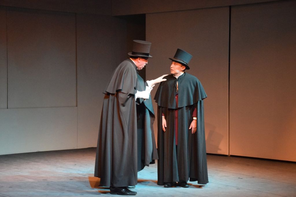 Итак... В уездный город приезжает молодой авантюрист, коллежский советник Чичиков, с целью провернуть хитроумную аферу за счёт душ, существующих только на бумаге т.е. скупать у здешних помещиков мертвые крестьянские души и занять в обществе высокий статус как владельца многих крестьян. Чичиков ловок на обман, обходителен, может вовремя польстить, умеет поддержать беседу на любую тему, найти подход к каждому человеку, и легко становится желанным гостем у каждого... тем не менее, в конце спектакля, оказавшись на волоске от разоблачения, вынужден спешно покинуть город.