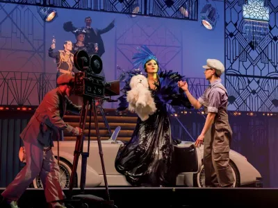 Московский театр оперетты, который неоднократно ставил эту классическую оперетту Франца Легара, на этот раз решил пофантазировать на тему съемок «Весёлой вдовы» в кино. Грандиозные танцевальные композиции и стильные пластические картины. Модные костюмы начала 20-го века и роскошные бальные наряды с боа, перьями и шляпами... На сцене со всей роскошью эпохи ар-деко создан мир театра и кино, пропитанный настроением старого Голливуда. Великолепная музыка Франца Легара не просто ведет за собой действие, она соединяет иллюзорный мир театра и кино с жизнью, размывая тонкие грани между ними. Благодаря трансформирующимся декорациям и спецэффектам, мгновенно меняющим сценическое пространство, зрители становятся не только свидетелями, но и, практически, участниками съемочного процесса в котором сцена превращается то в киностудию, то в залы и парк посольства, то в знаменитый ресторан Maxim’s. Оперетта в 2-х действиях