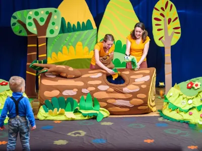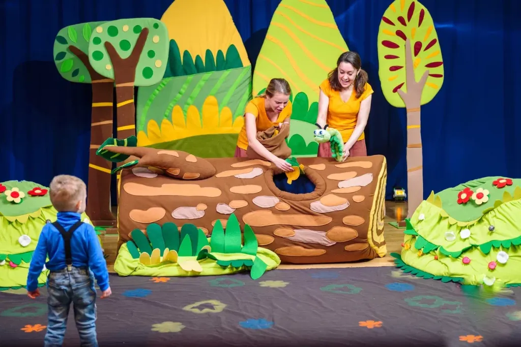 А пока взрослые удивляются и умиляются, у малышей забот невпроворот, они самые настоящие участники постановки: вырастим цветочки и будем танцевать под дождем из мыльных пузырей. Спасём гусеницу Зеленуху от Совы! Поможем Ёжику собирать грибочки, а мистеру Шмелю – нектар. А в конце сказки малыши сами превратятся в прекрасных бабочек и будут веселиться под дождиком из мыльных пузырей.