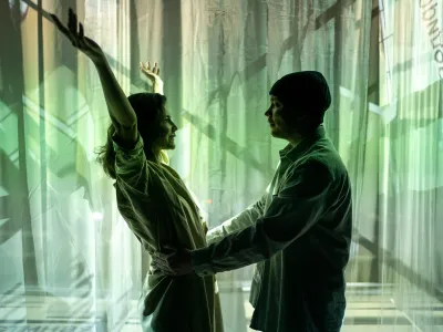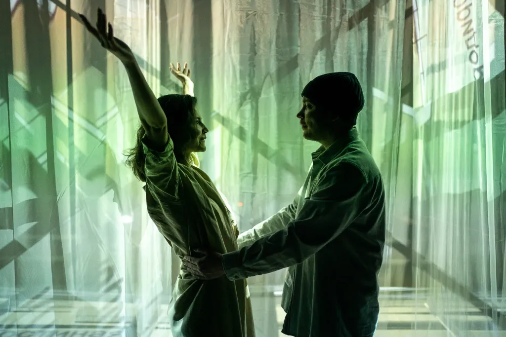 Режиссер Леонид Прокофьев и художница Ольга Павлович создали сцену-лабиринт из световых проекций, где пространство реагирует на эмоции и движения. Простая, но выразительная сценография и живая музыка мультиинструменталиста с вибрациями поющих чаш создают медитативный ритм, работающий не только с восприятием, но и с телом.