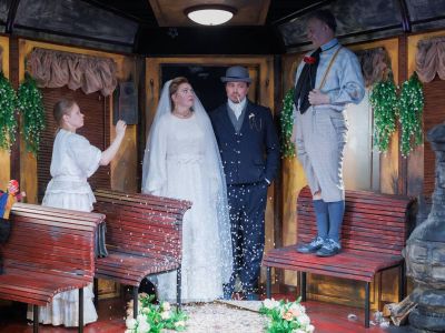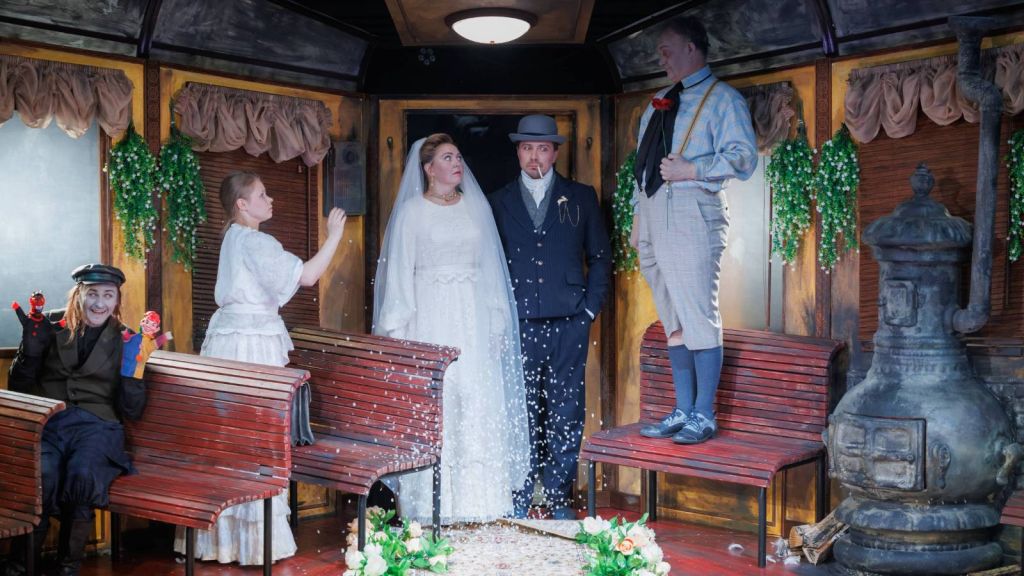Режиссёр Тимур Кулов и художник Николь Кламперт помещают персонажей «Каиновой печати» в некий мистический поезд (или заблудившийся трамвай?), на всех парах несущийся то ли к исполнению заветных желаний героев, то ли к тотальному крушению. Бой-баба, рвущаяся из грязи в князи, горе-супермен, ставший безвольной машиной для убийства, одинокий старик-эротоман, одновременно отвратительный и трогательный, спившийся аристократ со своим незадачливым ангелом-хранителем — все они, живые и мертвые, посажены в этот поезд, словно в чистилище, пока не сотрут с себя каинову печать совершённого греха.