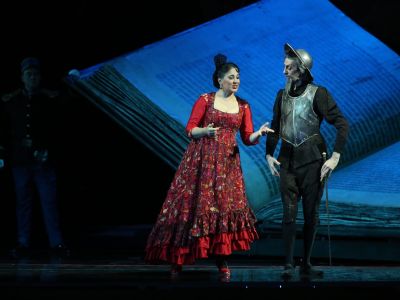 В мариинском «Дон Кихоте» три важнейшие линии — испанская, французская и русская — тонко переплетаются. Оперу поставил в 2012 году Яннис Коккос — французский режиссёр и сценограф греческого происхождения. Сценографической доминантой он сделал книгу: герои оперы буквально сходят с её страниц. Но этот фолиант — не только роман Сервантеса; книга становится символом идеального мира, в котором живёт чудачествующий старик Алонсо Кихано. Книги питают его воображение, вдохновляют на подвиги, заслоняют реальность до такой степени, что, по слову Тургенева, «самая несомненная вещественность исчезает перед его глазами, тает как воск от огня его энтузиазма». Исчезает словно в тумане, недаром Яннис Коккос заволакивает сцену сизоватой дымкой. Странствия рыцаря-фантазера постановщик назвал «путешествием без движения в едином пространстве», «вариациями сна». Призрачную атмосферу французского fin de siècle воссоздает театр теней: на театральном заднике проецируются силуэты всадников, один из которых — на коне, другой — на осле. Оказавшись на сцене — рядом с книгой, фигурки лошадки и ослика в соизмерении с ней кажутся оловянными сувенирами, а сам Дон Кихот напоминает популярную каслинскую статуэтку, восходящую, в свою очередь, к легендарному шаляпинскому прототипу.