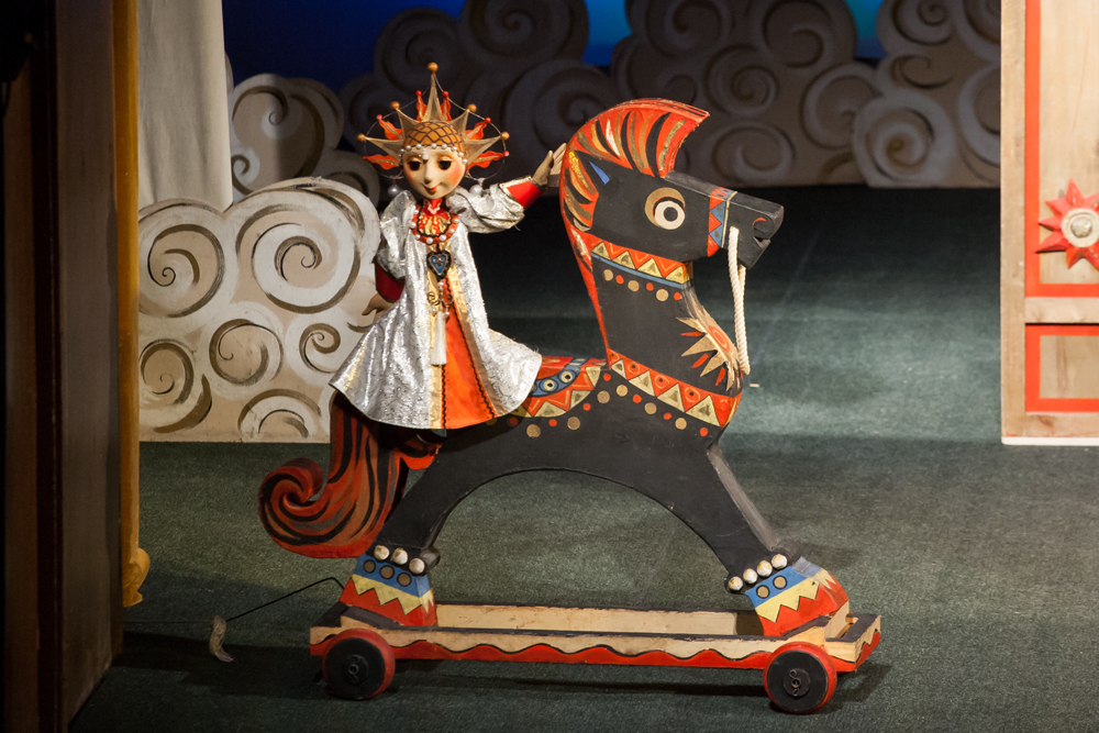 В спектакле «Конек-горбунок» много самых разнообразных кукол: от маленьких жителей острова (куклы, надеваемые на пальчики) и до огромного кита, на котором город стоит.