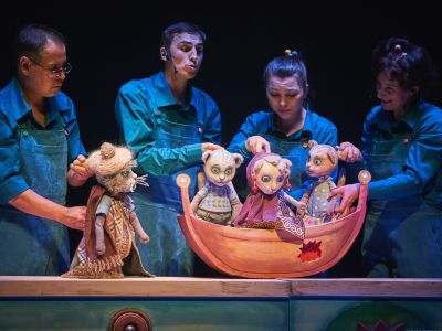 Зрителей ждут удивительно красивые декорации художника Ольги Смагиной, где каждый дом в кукольном городке, где живут Козел, Свинья, Курица и сама Кошка, придуман как забавная механическая игрушка.