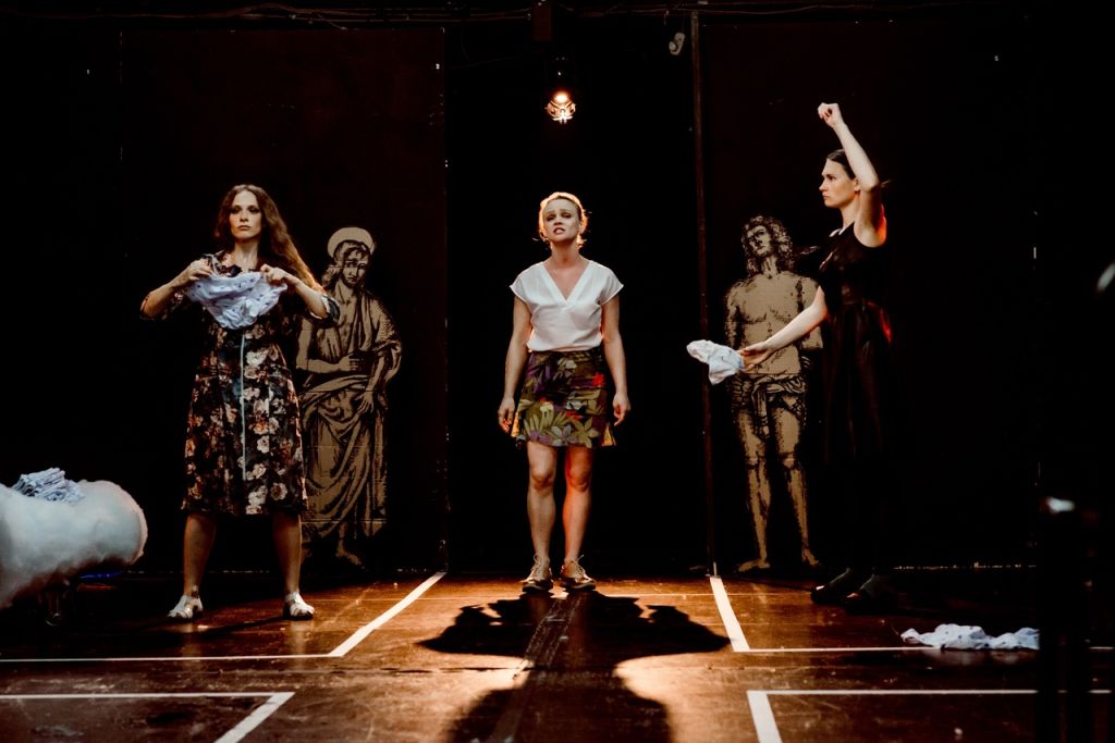 «больше чем меньше» — обжигающий ироничный спектакль-ощущение. Вот герои на швейной фабрике, собрании секты, лесопилке, танцплощадке — но уже через секунду они оказываются на территории бессознательного, нереального, запретного, управляющего сознанием.
