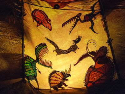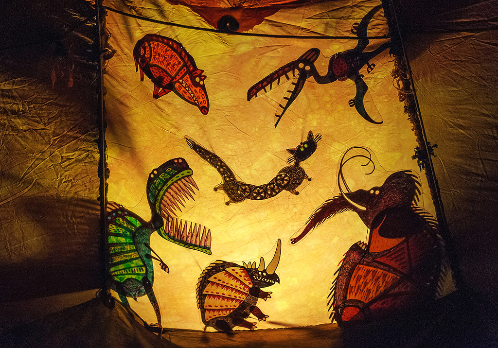 Зрители рассаживаются на полу, а актёры работают снаружи, их разделяет тонкая ткань, которой обтянуты стенки шатра. При помощи специальной подсветки на неё проецируются теневые фигурки персонажей — семья первобытных людей, животных, доисторических обитателей земли — динозавров, птиц, рыб.
