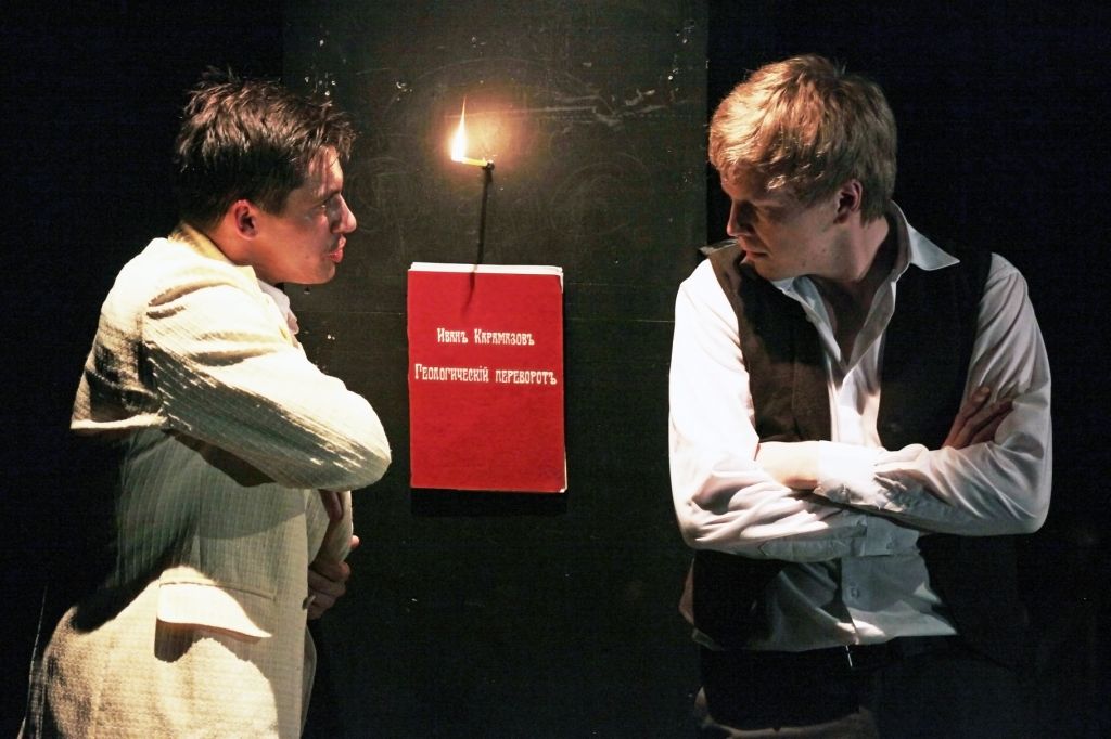 Достоевский без достоевщины, под живой оркестрик, с разбитным рассказчиком, «было у отца три сына», сказочка такая со страшным концом. Подтянутый лощеный русский интеллигент встречается с мороком, разбитным хулиганом и балагуром Чёртом и вступает с ним в спор, сперва снисходительно, потом втягиваясь всерьёз, — и не может победить. Потому что этот Чёрт — часть его идеи и часть его души.
