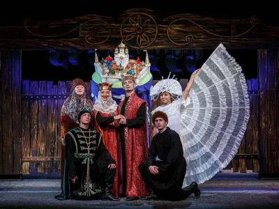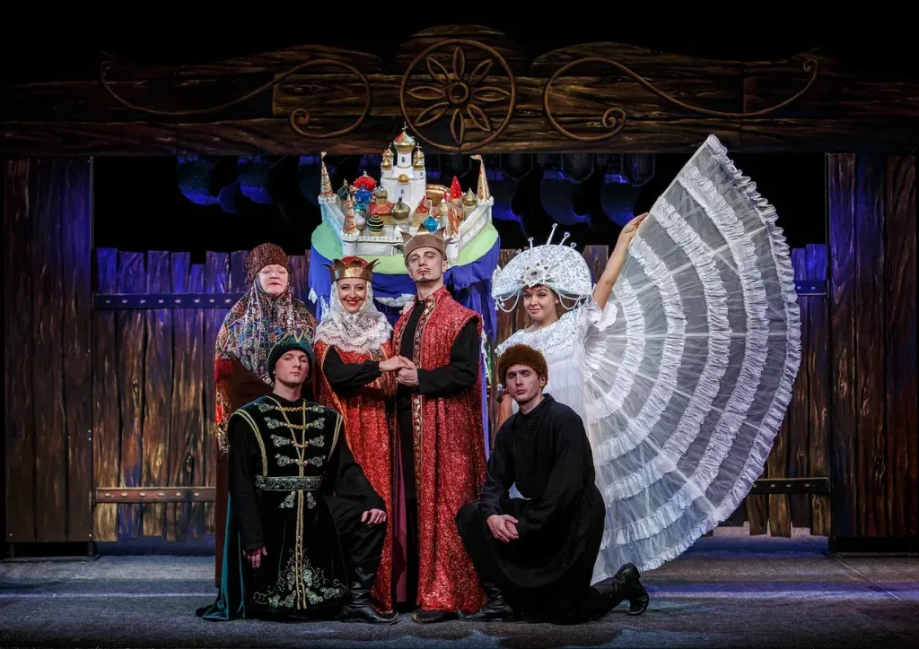 Волшебное музыкальное представление, созданное по одной из самых известных сказок Пушкина, воспевающее силу любви, красоты и всепрощения, несомненно, очарует даже неискушённого зрителя. А знакомые с детства стихи великого поэта, бережно вплетённые в ткань спектакля в неизменном виде, доставят истинное наслаждение большим и маленьким ценителям прекрасного. Прядут три сестры. «Кабы я была царица,- размечталась старшая,- то сама бы на весь мир приготовила я пир». Ей вторит средняя сестра: будь она царицей, наткала бы на весь мир полотна. Младшая же говорит, что она не мастерица ни печь, ни ткать; она бы «для батюшки царя родила богатыря». Только молвила — в светлицу входит царь Салтан и велит ей без промедления собираться ехать во дворец. Быть ей царицей, а сестры будут: одна — поварихой, а другая — ткачихой. Завистью исходят старшие сестры; подговаривают они сватью бабу Бабариху наворожить беду...