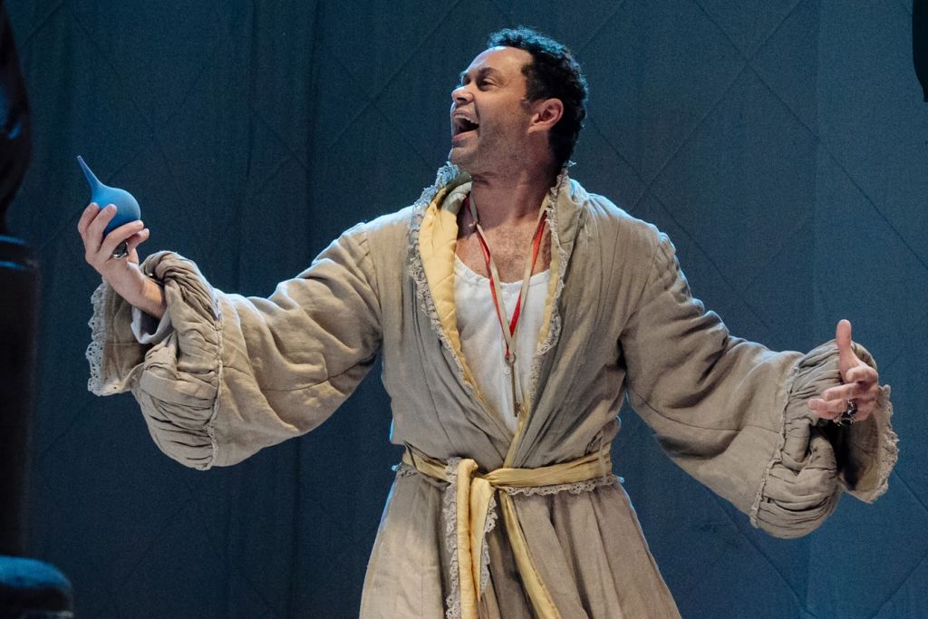 Отточенные реплики, игра смыслами и словами — эпохи смешиваются, аллюзии неожиданно становятся очевидными. Роль мнимого больного разыгрывается так, что веришь в искреннее убеждение героя: мир можно заставить вращаться вокруг себя. А вот можно ли заставить окружающих тебя любить? Наивность не прощается — мошенники от медицины, аптекари, священники и прочий ушлый люд тут как тут.