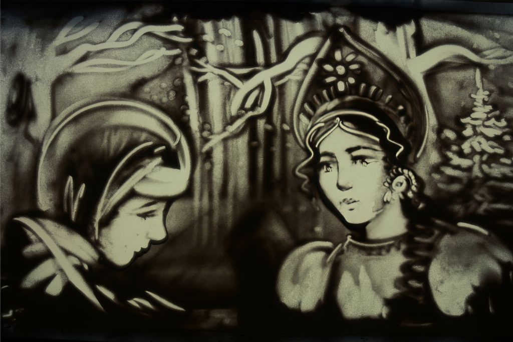 В постановке звучат слова автора, вместе с которым создаются картины из песка, такие тонкие и хрупкие, что любое дуновение ветерка рассеет прекрасный образ. Художник песочной анимации создает из песчинок художественный образ здесь и сейчас, при зрителях.