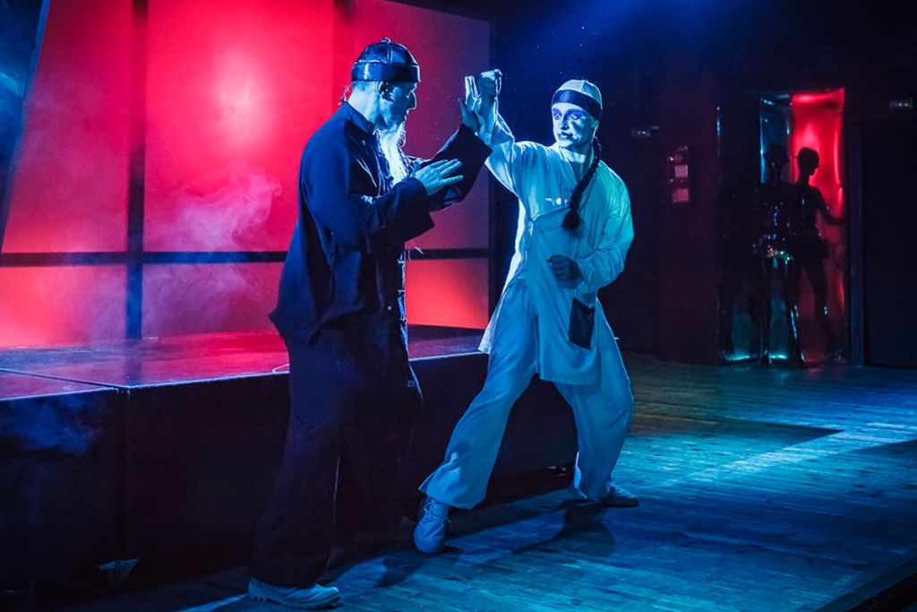 В нашем спектакле актеры в головокружительном ритме легко меняются ролями, мастерски фехтуют текстом, на ходу создавая до боли знакомые образы.