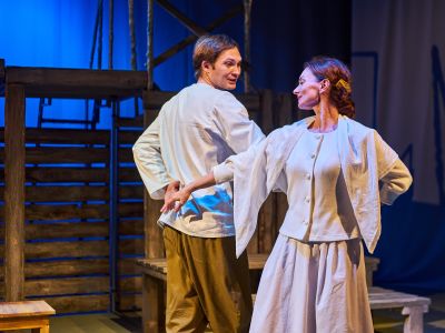 Спектакль «Синяя-синяя речка» посвящён 75-летию победы в Великой Отечественной войне. Но зритель не увидит на сцене театра сражений, не испытает высокое чувство пафоса, да и сама война здесь проходит фоном, где-то далеко. На первый план в новом спектакле Молодёжного театра выступают темы любви и непобедимости жизни. Спектакль, поставленный художественным руководителем театра Мусалимом Кульбаевым по мотивам повести Бориса Вахтина «Одна абсолютно счастливая деревня», повествует о молодой женщине, ставшей вдовой в самом начале войны. Солдат возносится на небо и оттуда ведет мистический диалог со своей женой…