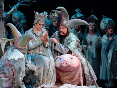«Сказка о царе Салтане» была поставлена на нашей сцене в 1997 году. Зрелищный, полный фантазии спектакль создали режиссер Александр Титель и художники Юрий Устинов и Ирина Акимова. Премьерой дирижировал Ара Карапетян.