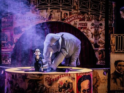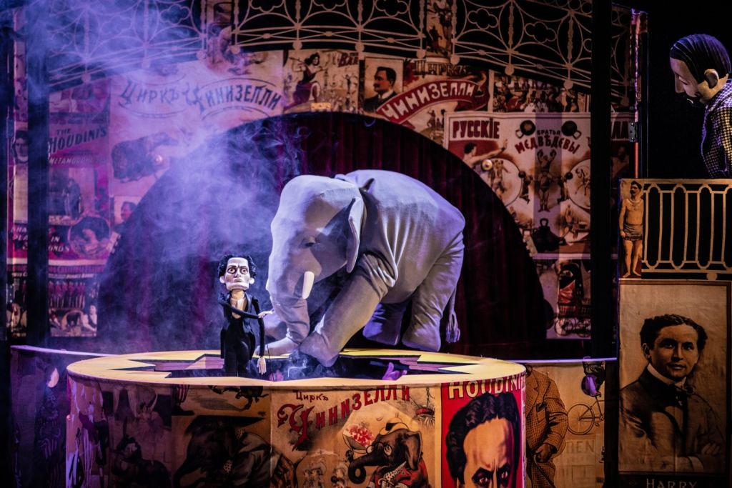 Спектакль «Слон» – признание в любви Санкт-Петербургу и красивейшей эпохе – началу ХХ века. Город – важное действующее лицо спектакля, его арки и набережные, грифоны и сфинксы, мосты и атланты – полноправные участники событий спектакля, наряду с куклами и актерами. Здесь возникает и тема старого петербургского цирка, в котором выступает всемирно известный фокусник Гудини, показывая свой знаменитый номер – исчезновение слона.