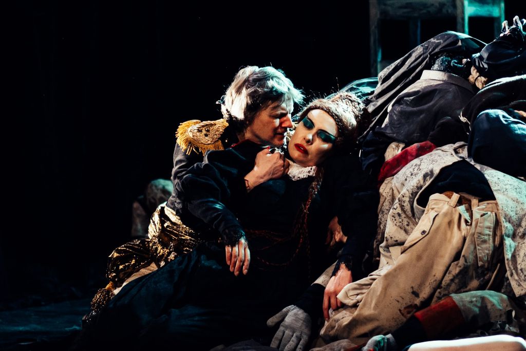 «Король Лир», созданный в откровенной игровой природе, перекликается с первыми постановками НДТ, которые были поставлены в остром жанре трагифарса, гиньоля, гротеска. Эренбург определяет жанр спектакля как «кровавая клоунада». В постановке НДТ ужасы Средневековья наводят на ассоциации с заносчивостью и жестокостью людей сегодняшних, глухих к голосу разума, готовых на всё ради собственной правоты и выгоды.