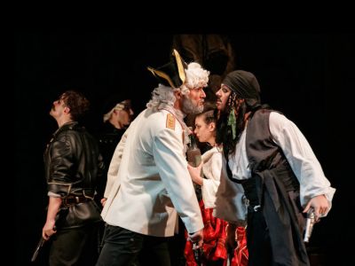 Музыкальная феерия «Остров сокровищ» появилась как дипломный спектакль выпускников Театрального института им. Б. Щукина. Художественный руководитель Театра «У Никитских ворот» Марк Розовский увидел студенческую постановку и был очарован её истинно вахтанговским духом и яркими актерскими работами. Пиратская комедия приключений, как называют спектакль создатели, наполнена громкой музыкой, искрящимся юмором и эффектными трюками. «Остров сокровищ» – это яркое действо, где связанные единым сюжетом сцены динамично сменяют друг друга, артисты в образе благородных героев или ужасных пиратов, отправляясь в опасное морское путешествие за сокровищами, борются с водной стихией, стреляют, сражаются на шпагах, а ещё – смеются, поют и танцуют… Всем, кто знает толк в ветрах странствий и приключениях, от юных до весьма взрослых, постановка придется по душе. Зрители из городской суеты перенесутся прямиком на остров «Сундук мертвеца», со всех сторон омываемый океаном. Текст романа, написанного в 1883 году, звучит очень современно. Этому способствуют слегка «усовершенствованный» юмор и то, что герои спектакля частенько напоминают персонажей самых известных и любимых фильмов и мультфильмов о пиратах. Итак, подросток Джим Хокинс очень любит истории о морских приключениях и мечтает стать капитаном…