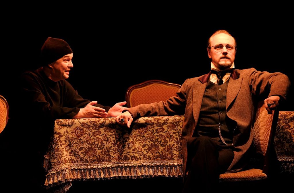 Театр продолжает диалог с автором о Боге и бессмертии души, о времени и месте человека в нём. О человеке, терзаемом сомнениями, раздираемом страстями, жаждущем любви, денег, власти, мечущемся от добра ко злу и от зла к добру. Человеке, ищущем свой путь, свою веру, своего Бога. Всё это оживает на сцене, превращаясь в сумасшедший водоворот. Спектакль как гипнотический сеанс. Зрителя постепенно втягивают в запутанный лабиринт чувств, а потом шквалом обрушивают на него жар неистовых страстей.
